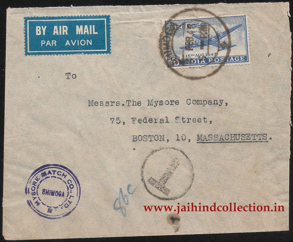 Postage Due Cover to USA 12 annas rated cover from Shimoga to USA. Dated 3 February 1948. Shortpaid and hence marked postage due.